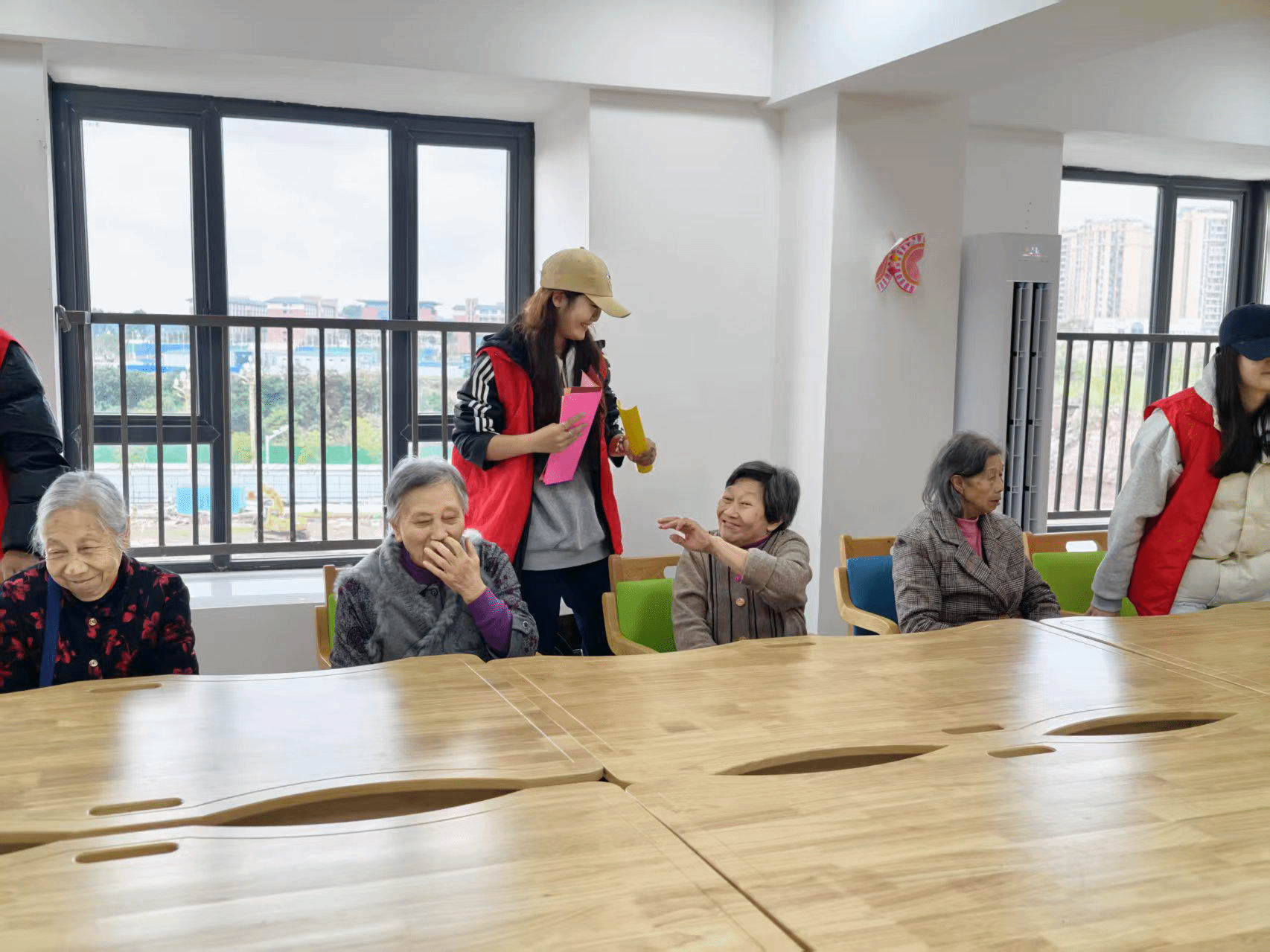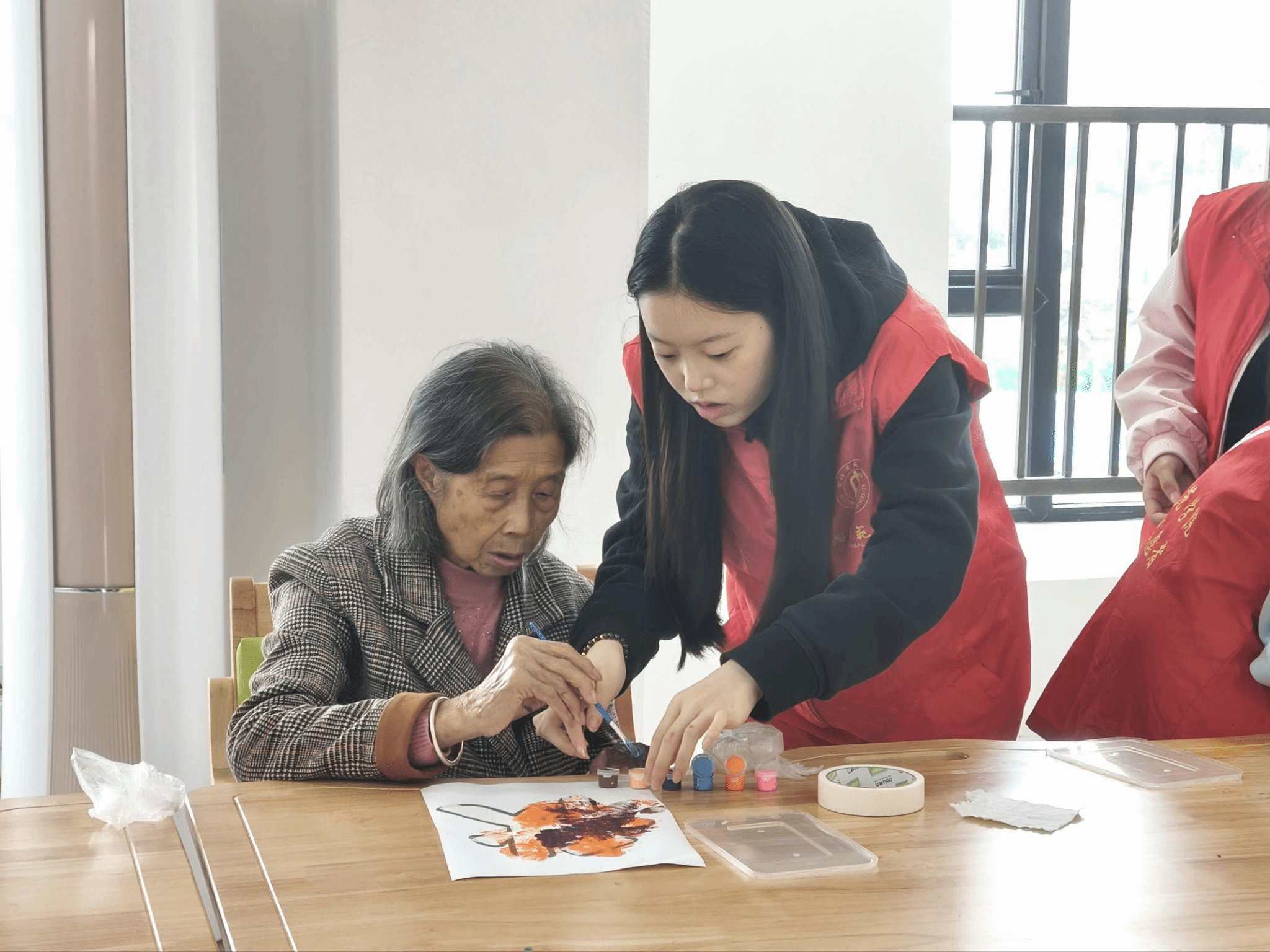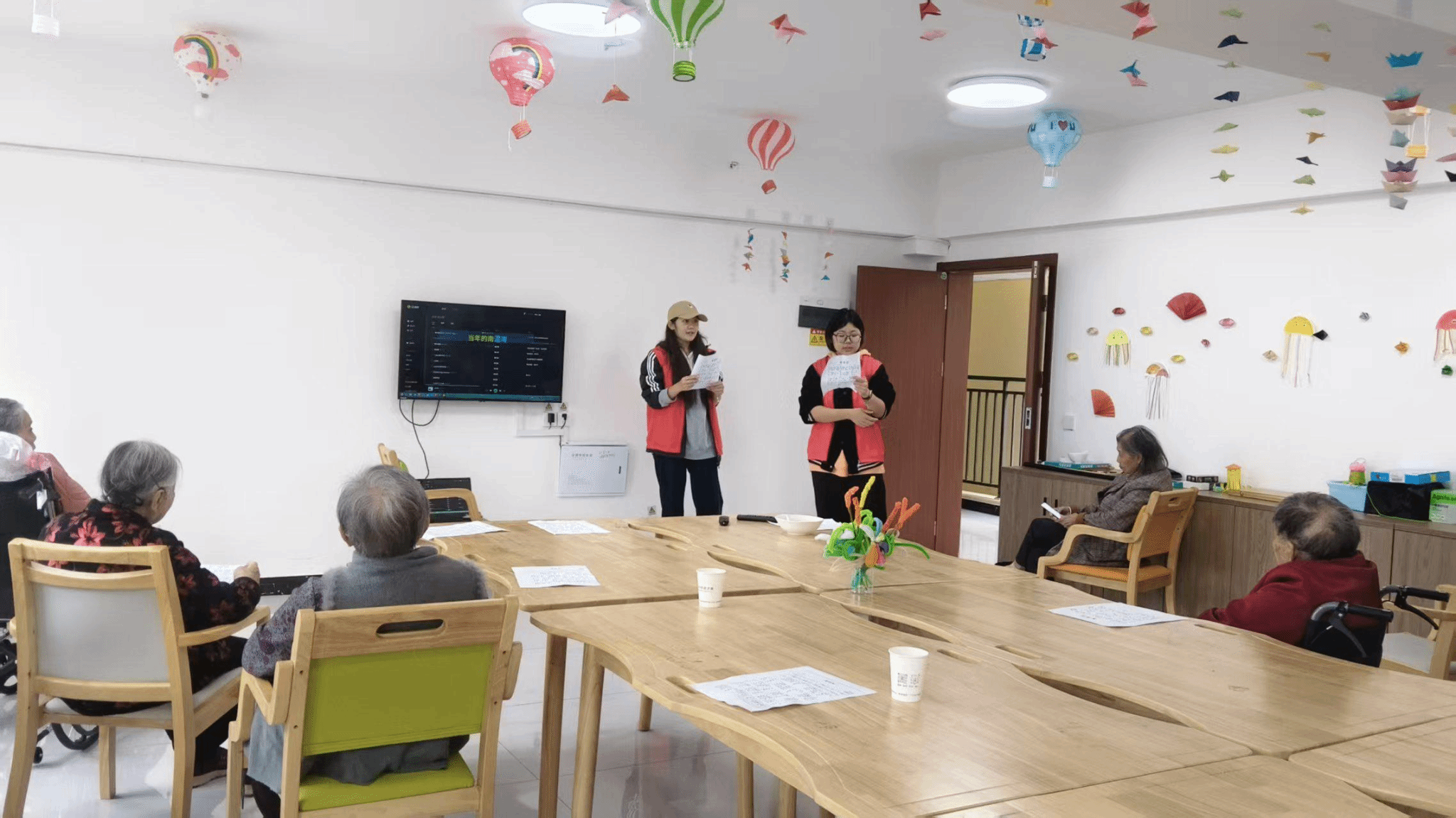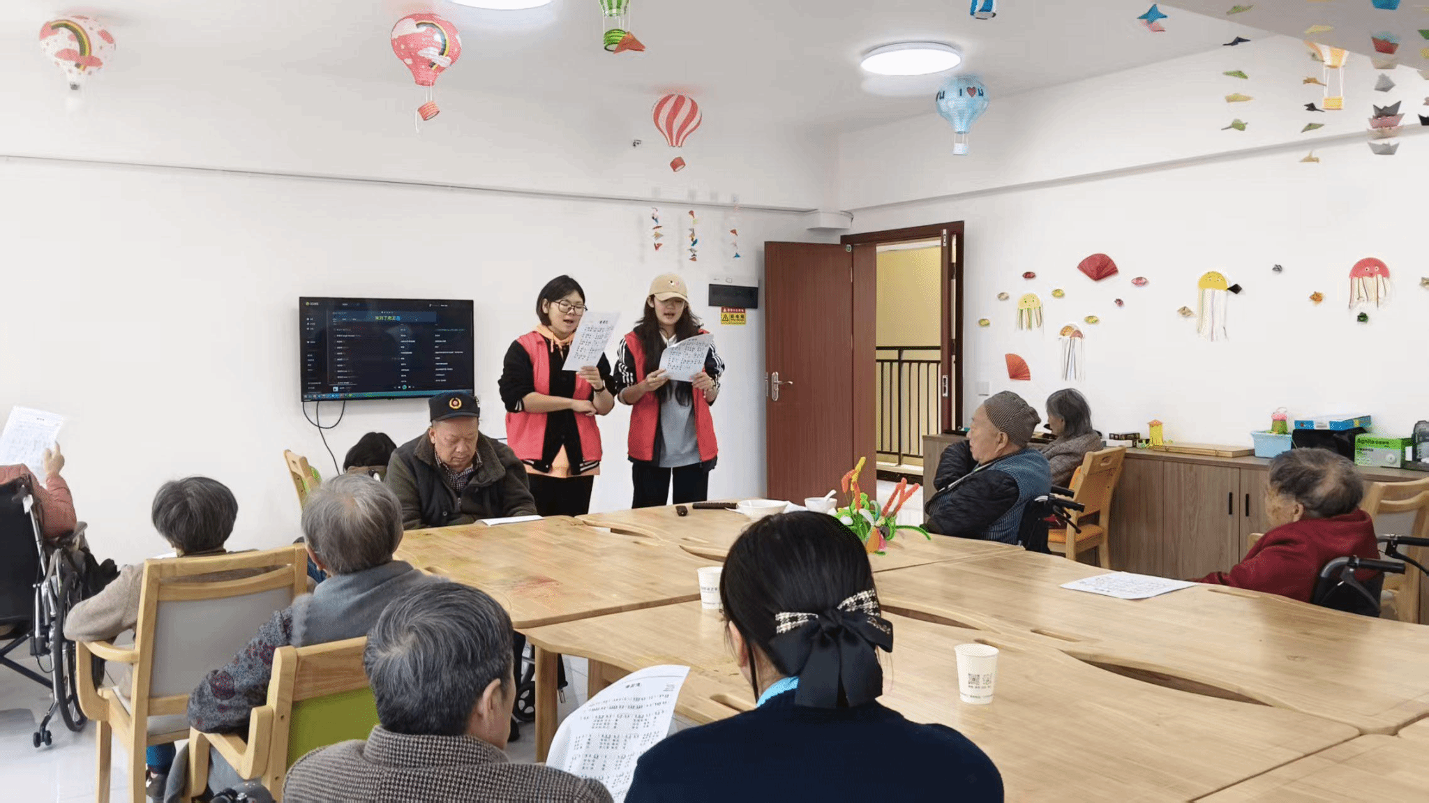 次日上午,5名志愿者继续开展“银龄颂华章·青春奏心曲”主题活动。志愿者首先带来精彩的爱国主题才艺表演,随后带领老人们共同演唱《我爱你中国》,并开展歌曲教学。活动现场还教学了手势舞《啦桑桑》,并组织老人与志愿者一同制作传统窗花。在温馨的互动中,青春活力与银龄风采交相辉映,传递出浓浓的爱国情与敬老意。