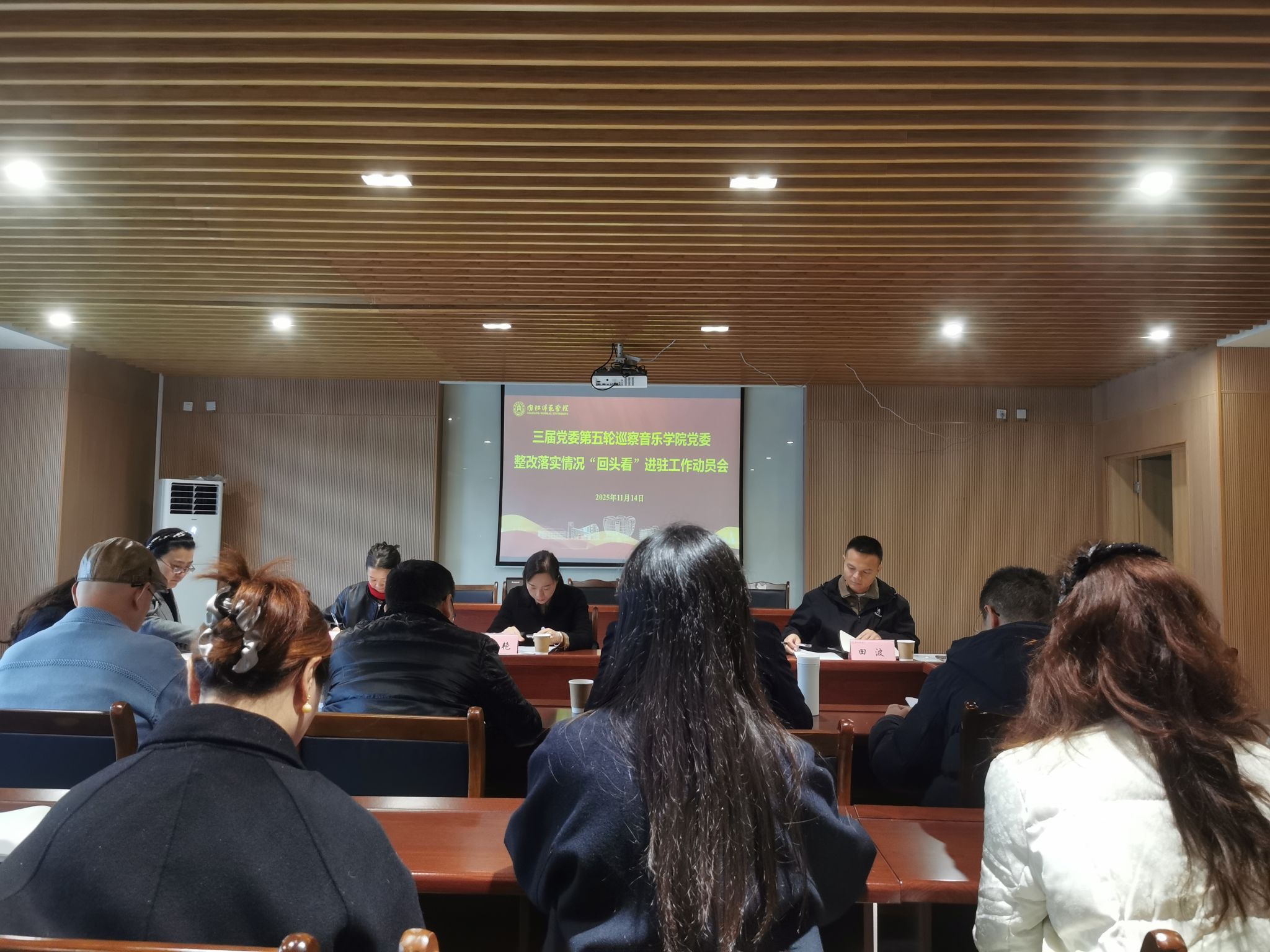 2025年11月14日上午,集团三届党委第五轮巡察公司党委整改落实情况“回头看”进驻工作动员会在伯牙楼C507会议室召开,党委第五巡察组组长邓小明、副组长蒋明芳及全体成员,党委巡察工作领导小组成员、校纪委副书记覃华艳,校巡察办副主任田波出席会议。公司党政班子成员、科级干部、系主任、教研室主任、艺术中心主任、师生代表、离退休代表和纪委委员参加会议。