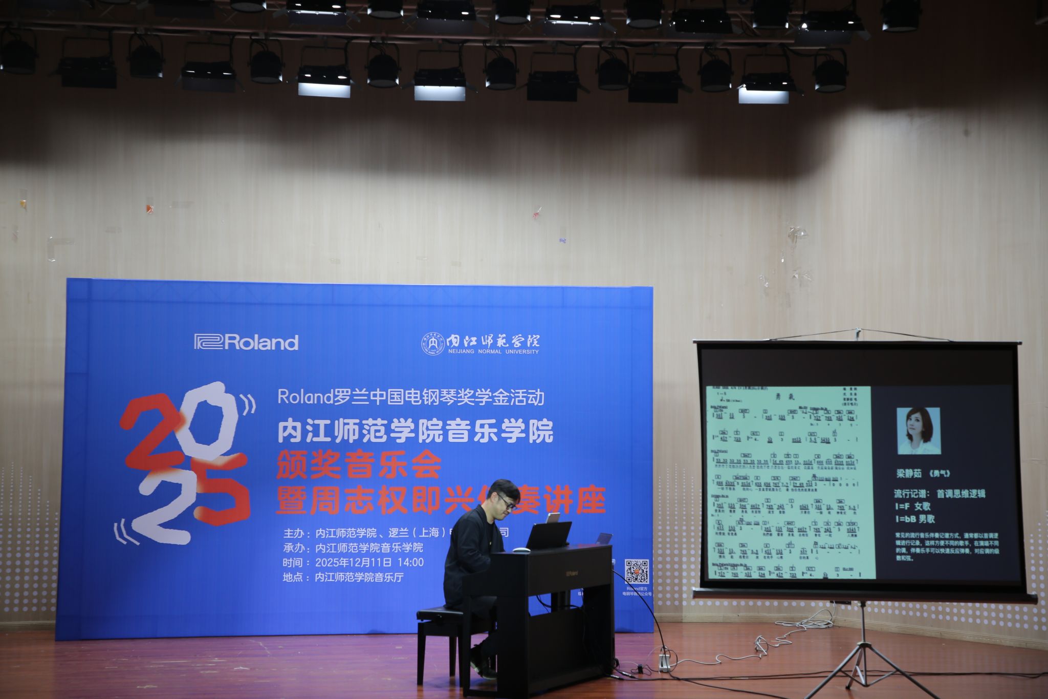 颁奖礼成后,公司特邀国际知名音乐设备品牌“逻兰”签约合作音乐人、青年演奏家周志权先生,为在场师生呈现了一场震撼的即兴伴奏专题讲座。周志权先生以深厚的演奏功底与活跃的创作思维,通过现场即兴演绎、互动问答与技法解析,生动阐释了即兴音乐在当代语境下的艺术价值与实践路径。讲座过程妙趣层出,启发性强,师生互动踊跃,艺术共鸣深刻。