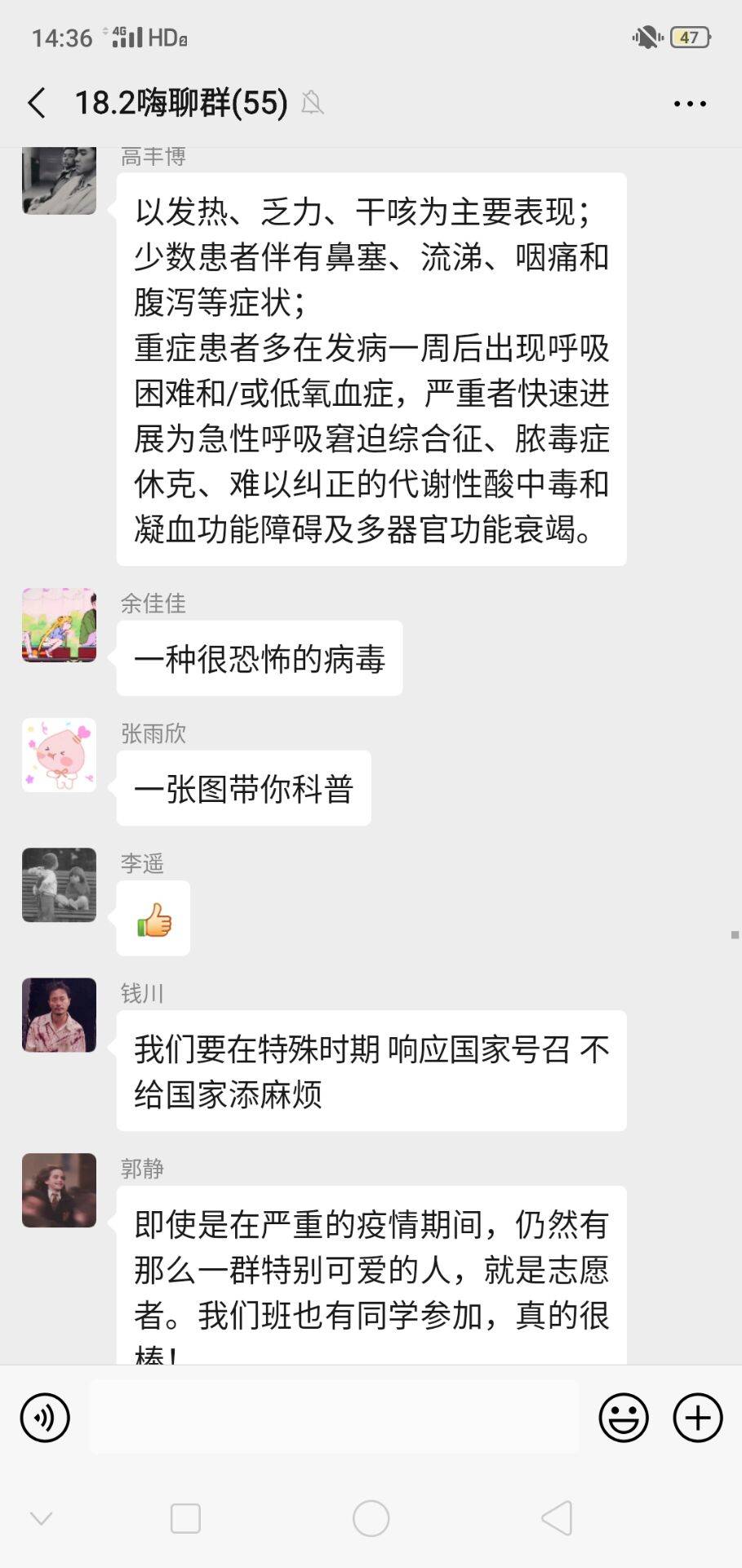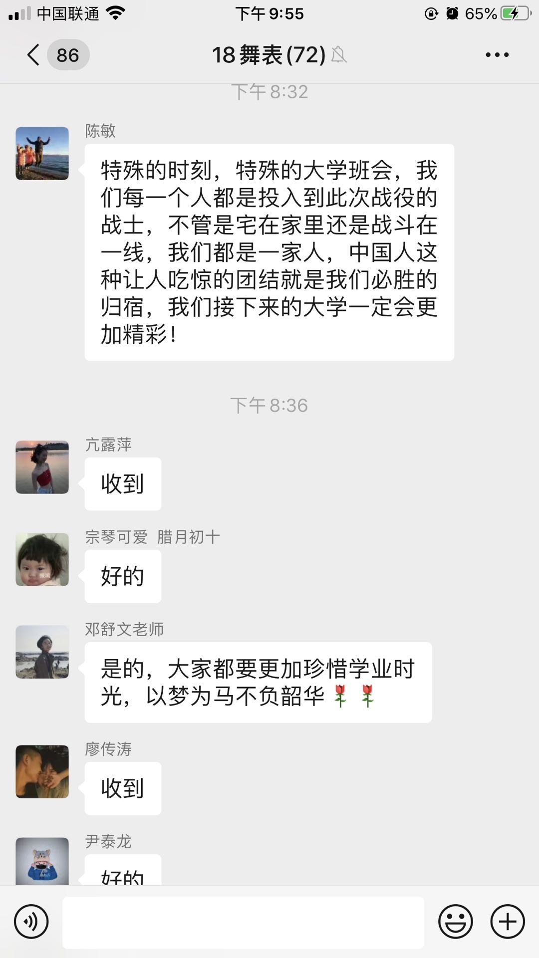 首先,各班学习了习近平总书记的重要指示,深刻感受到中国共产党的坚强领导,增强了员工的抗疫的信心,引导员工自觉服从并支持公司抗疫工作的展开。陈敏书记在18级4班班会中对全体同学表示了问候,同时要求同学们做好疫情防控,不信谣、不传谣,努力做一位有历史担当的的新时代青年。