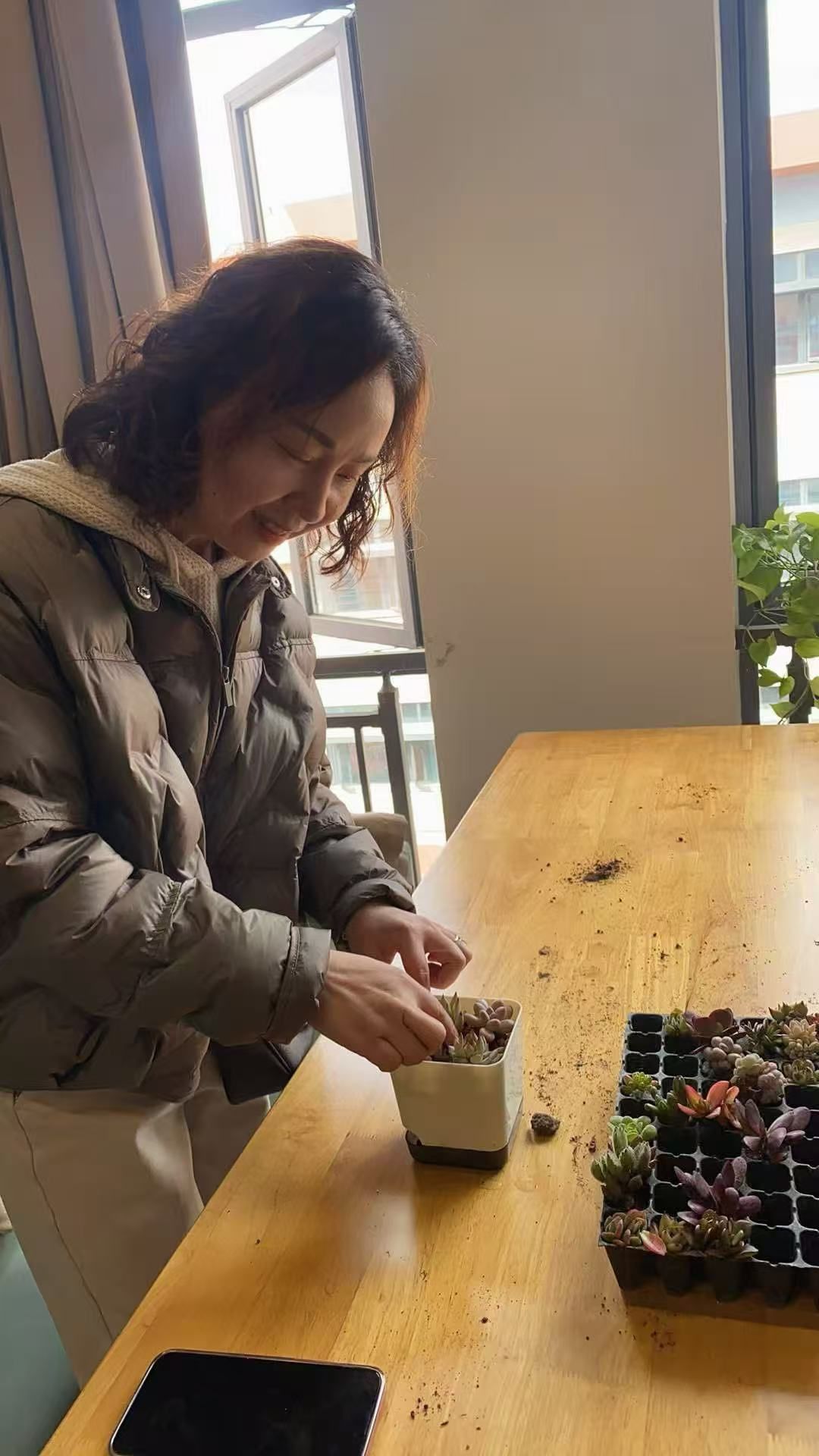 活动现场暖意融融、欢声笑语。在工作人员的引导下,女教职工们兴致勃勃地领取种植材料,动手开启多肉DIY创作。大家认真培土、精心栽种、巧妙铺面,充分发挥艺术审美,搭配出形态各异、清新可爱的多肉盆栽。种植过程中,老师们相互交流种植技巧、分享生活趣事,在动手实践中感受自然生机,在互动协作中增进情谊。