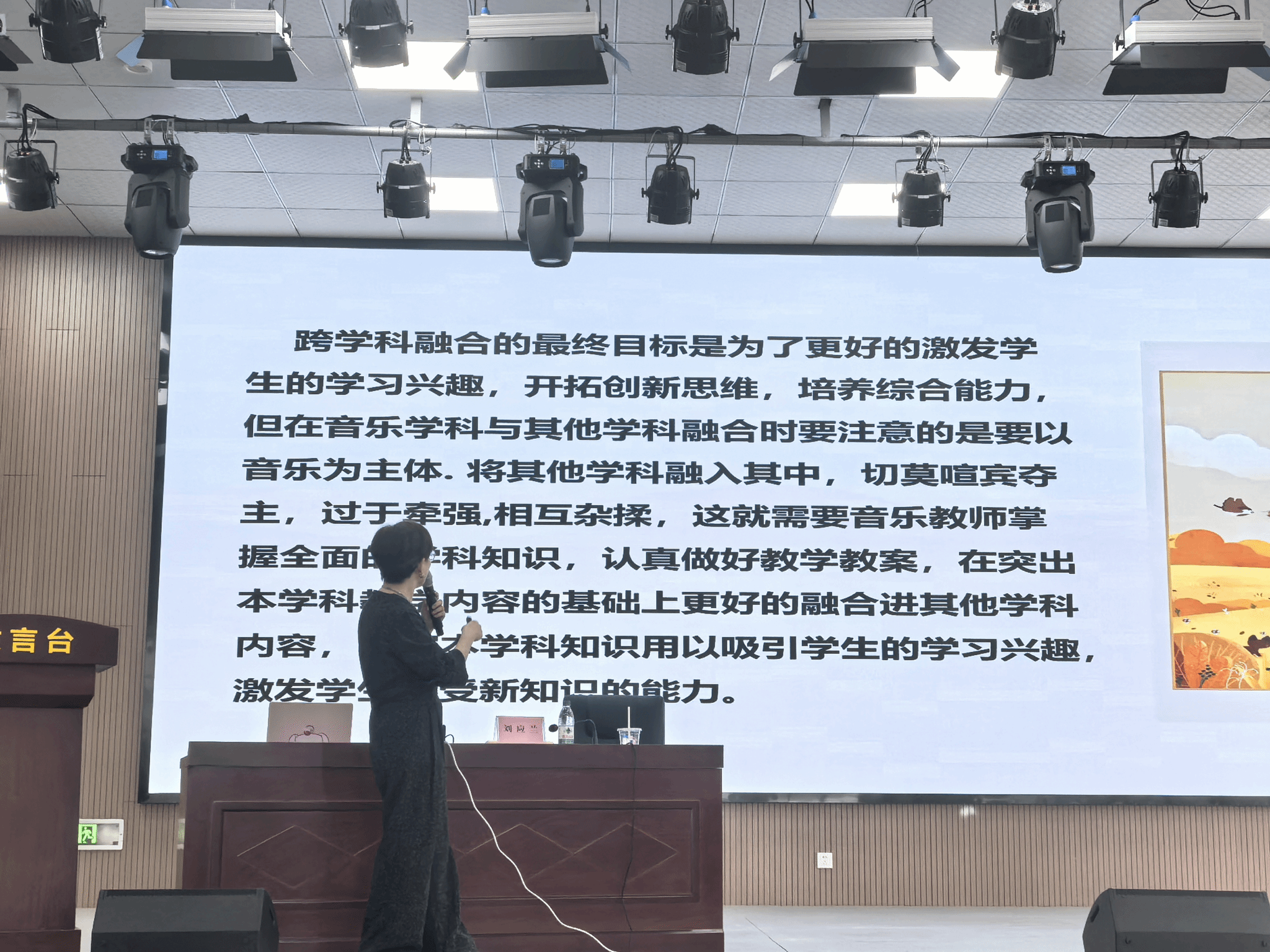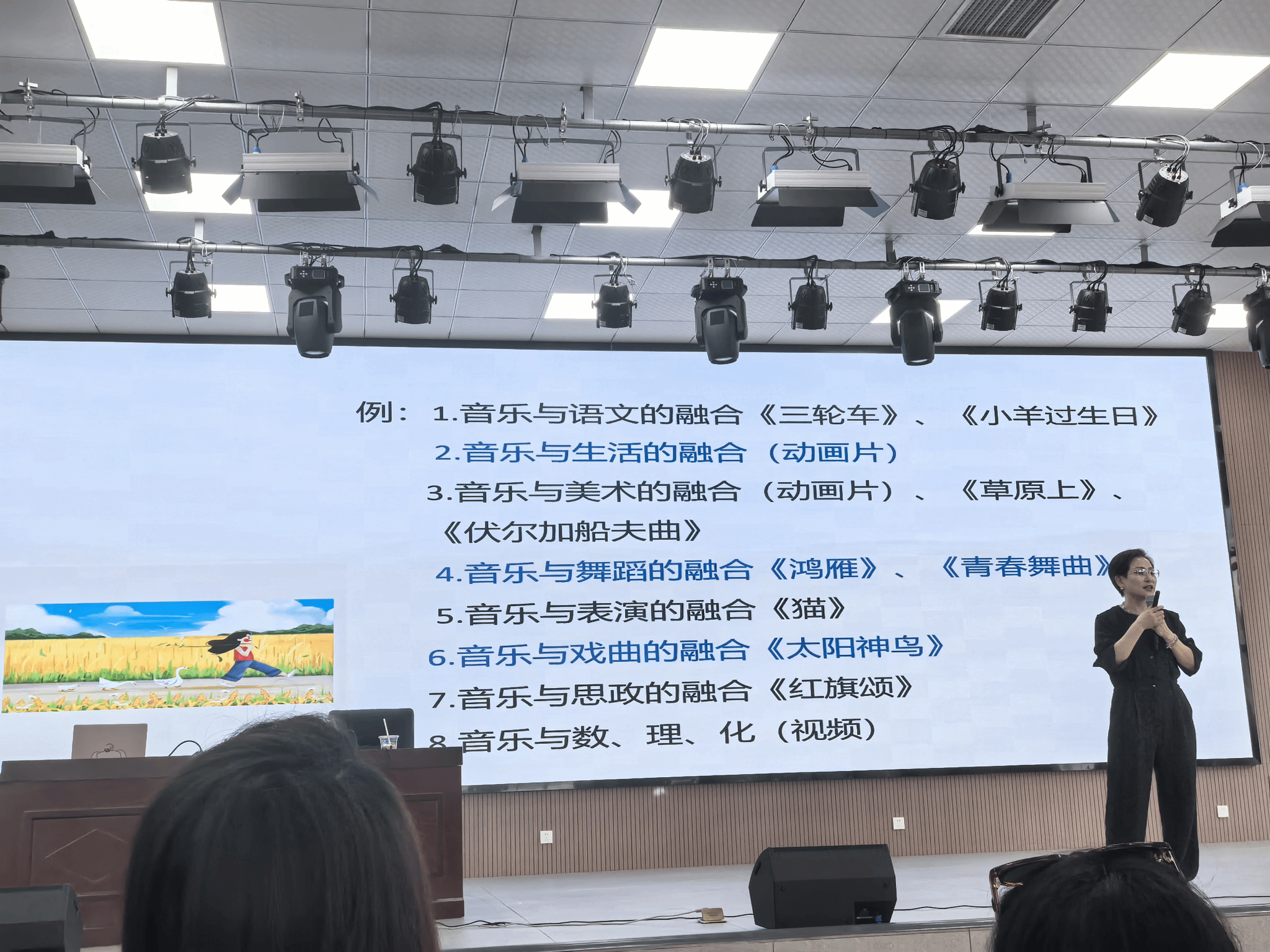 培训中,刘应兰老师针对“音乐学科跨学科融合需以音乐为主体”的核心观点,结合自身教研经验展开讲座交流。她认为,这一原则为跨学科教学划定了清晰边界——如在《伏尔加船夫曲》的教学中,可融入美术学科对“伏尔加河纤夫”画面的视觉解析,但需始终围绕音乐的节奏、旋律等核心要素展开;讲解《红旗颂》时,思政元素的融入应服务于音乐作品的情感表达,而非单纯的理论灌输。