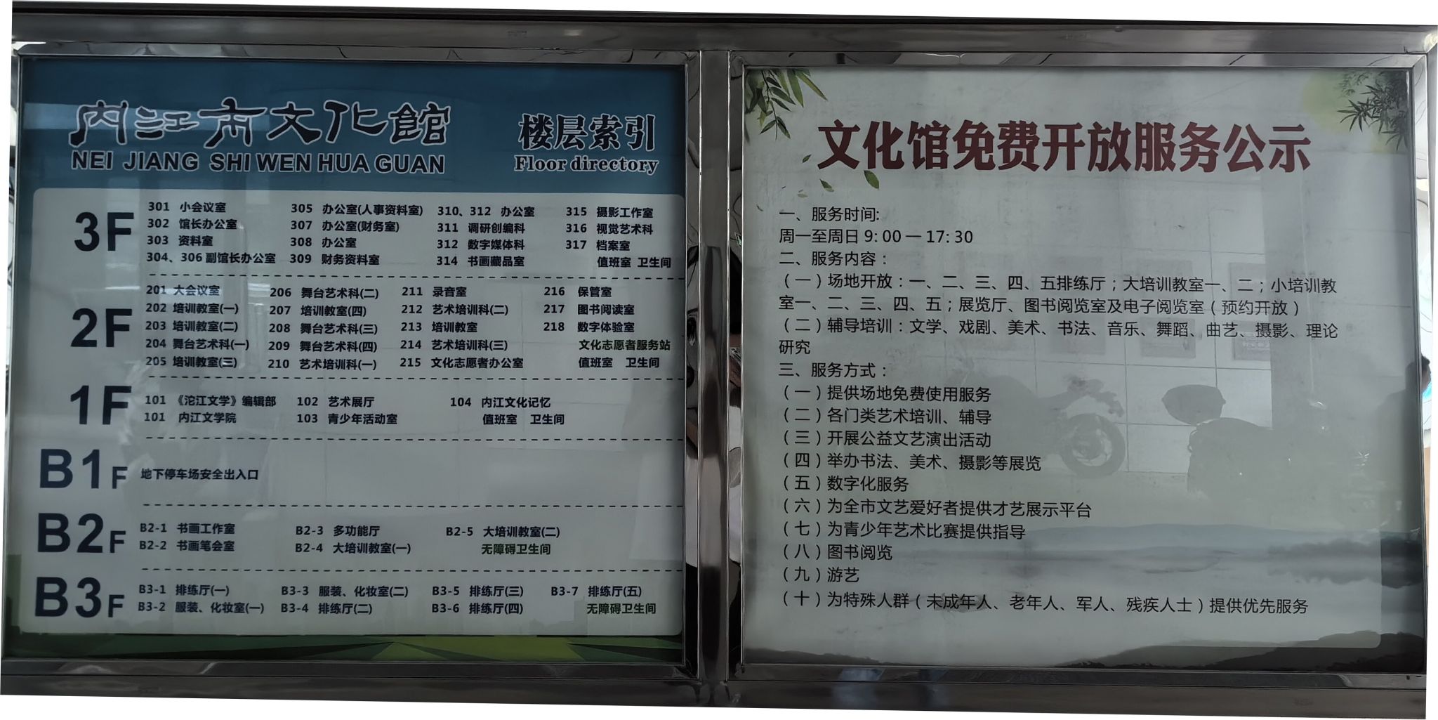 内江市文化馆是市文化广电和旅游局下属副县级公益一类事业单位,现位于东兴区大千路1375号内江市文化中心内。馆内设行政办公室、艺术培训科、舞台艺术科、视觉艺术科、调研创编科、数字媒体科六个科室。市文化馆主要承担全市群众文化艺术普及培训辅导、对外免费开放服务、群众文化活动组织策划、群众文艺创作调研等方面的工作。