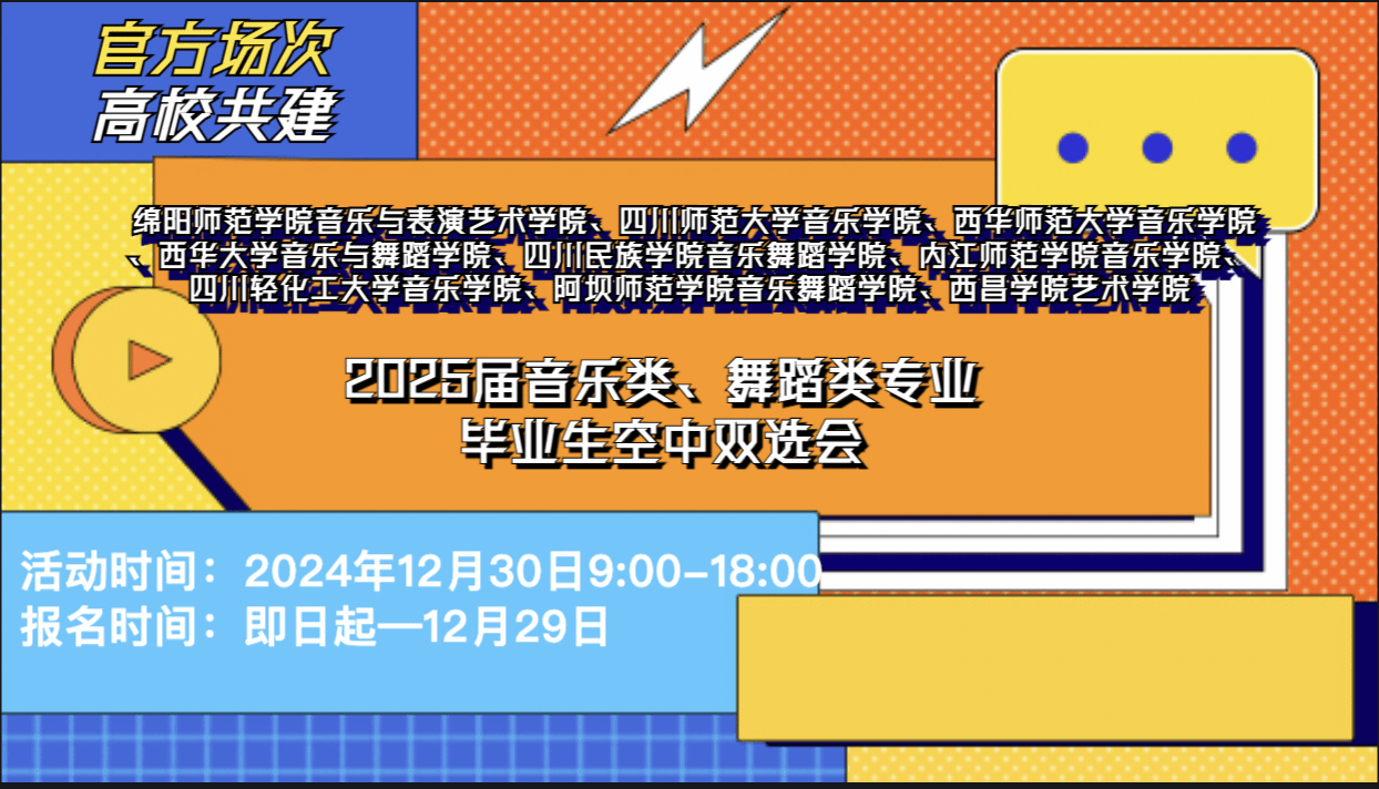 为全面贯彻落实教育部、四川省教育厅以及公司相关文件的要求,充分发挥校园招聘主渠道作用,为毕业生和用人单位搭建就业沟通平台,全力促进公司毕业生更加充分更高质量就业,现联合智联招聘举办“音乐类、舞蹈类专业毕业生”空中双选会。